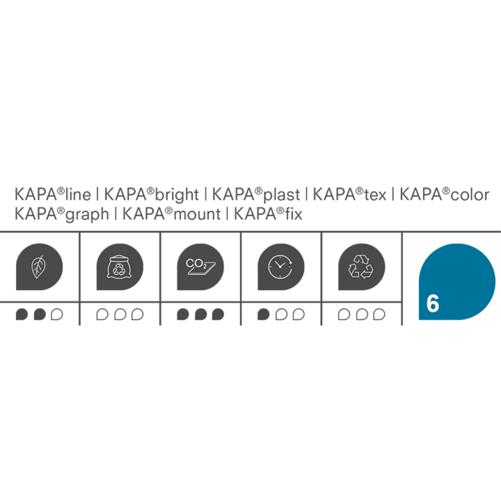 Maxiformat på KAPA®line är 3 050 x 2 030 mm (eller 6,2 m²). KAPA®line väger bara 4 000 gram med en skivtjocklek på 5 mm. Det stora formatet är en bonus speciellt inom plantryckssektorn, vilket ger bästa möjliga förutsättningar för en mer kostnadseffektiv tryckprocess. Kombinationen av låg vikt och hög hållfasthet är de avgörande egenskaperna hos KAPA®line.