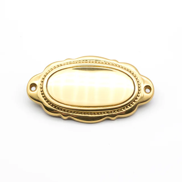 Dörrskylt i mässing, Oval med dekorativa kanter. Finns i Guld och Oxiderad variant. Storlek 115x60 mm.