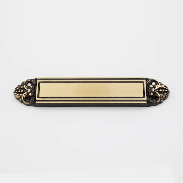 Dörrskylt i mässing med borstad yta och dekorativa oxiderade kanter, 180x35mm.