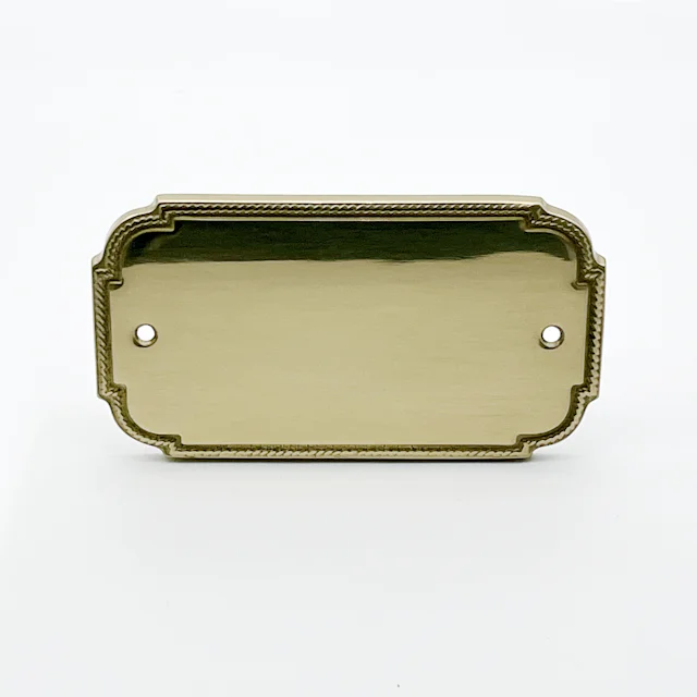 Rektangulär dörrskylt i mässing med dekorativ kant. Finns i blank guld eller oxiderat utförande. Storlek 138x76 mm.