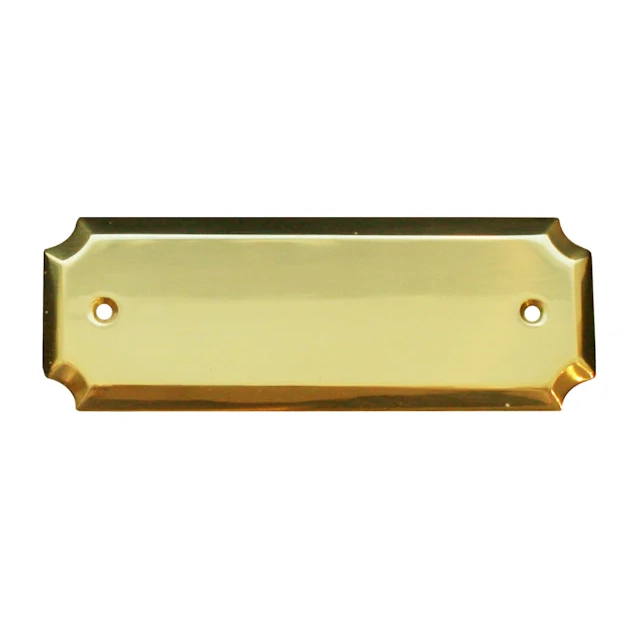 Rektangulär dörrskylt i blank mässing. Skylten har en snygg fasad kant med konkava hörn. Storlek 125x42 mm.